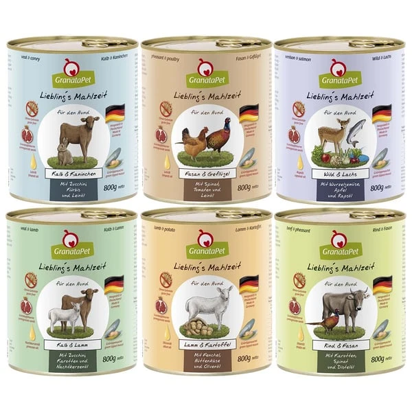 Kalbfleisch & Lammfleisch 65 % (35 % Kalb bestehend aus Muskelfleisch, Herz, Leber, Lunge, Pansen und 30 % Lamm bestehend aus Muskelfleisch, Herz, Leber, Lunge, Pansen), Fleischbrühe, Zucchini 3 %, Karotten 3 %, Kartoffeln 3 % Granatapfelkerne 1 % (getrocknet und fein vermahlen), Mineralstoffe, Nachtkerzenöl 0,5 %, Grünlippmuschel (0,1 %, fein vermahlen, von Natur aus reich an Glucosamin und Chondroitin)