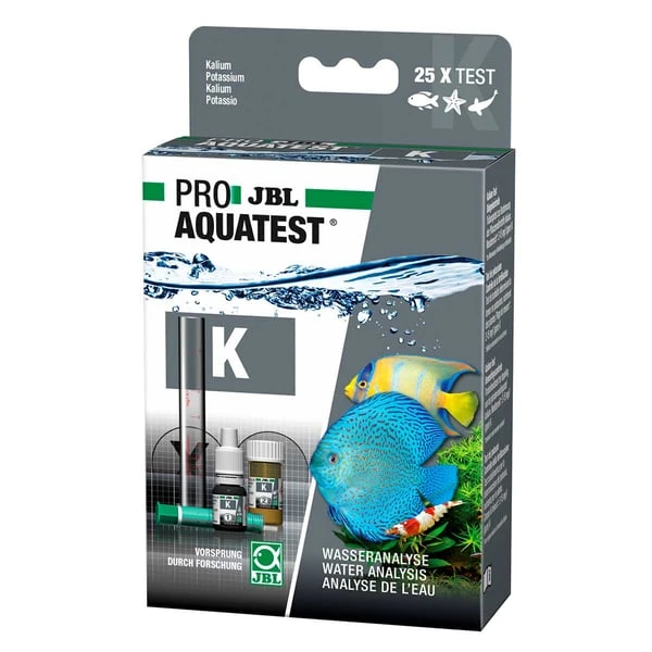Schnelltest zur Bestimmung des Kaliumgehalts in Süßwasser-Aquarien. Für perfekten Aquarienpflanzenwuchs: Bestimmung des optimalen Kaliumwertes zur Düngekontrolle für Süßwasser-Aquarien. Schnelltest: Küvette mit Probenwasser füllen, Reagenzien zugeben, eingetrübtes Probenwasser in Spezialglasküvette schütten bis darunterliegendes Kreuz nicht mehr sichtbar ist, eingefüllte Menge ablesen. Der Wert entspricht dem Kaliumgehalt in mg/l. Oft führt zu ein zu niedriger Kaliumgehalt zu stagnierendem Pflanzenwuchs, obwohl alle andere Faktoren wie CO2, Eisen und Licht vorhanden sind. Durch Dünger wie JBL Ferropol oder JBL ProScape K Macroelements können Sie den K-Gehalt erhöhen. Auf der JBL Homepage in der Themenwelt Aquarium finden Sie ausführliche Informationen zu Wasseranalysen und Problemlösungen. Lieferumfang: 1 Kalium-Test Set für ca. 25 Messungen inkl. 2 Reagenzien, Spezial-Glasküvette, Spritze, Dosierlöffel und Farbkarte. Nachfüll-Reagens separat erhältlich.