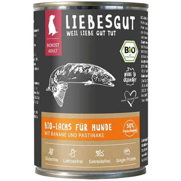 50% Lachs, 25% Pastinaken, 13,5 % Banane, 10 % Brühe; 1 % Mineralstoffe, 0,5 % Lachsöl, 0,5 % Lebertran