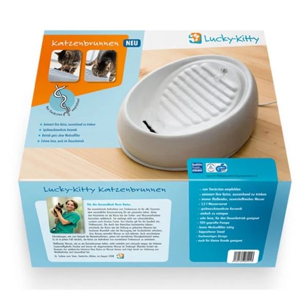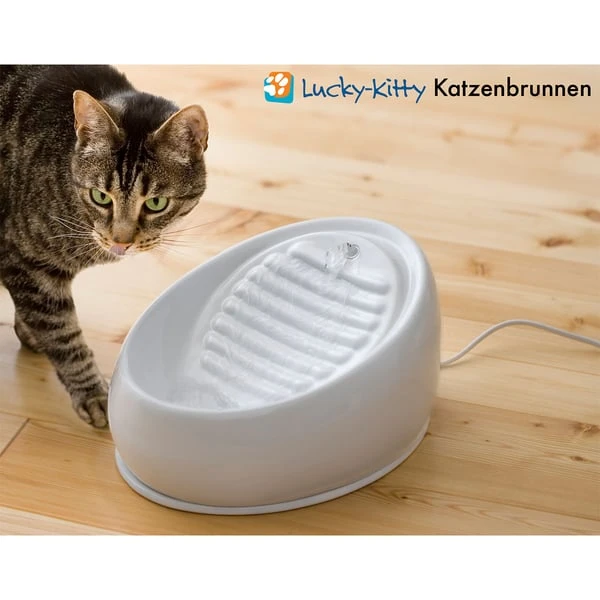 Der Lucky-Kitty Katzenbrunnen aus Keramik ist ein innovativer Trinkbrunnen, welcher speziell für Katzen entwickelt wurde. Er ermuntert deine Fellnase mit seinen unterschiedlichen Trinkzonen dazu, ausreichend Wasser zu trinken. Das kann potenziell dazu beitragen, Nierenerkrankungen vorzubeugen. Sowohl Menschen als auch Katzen schätzen den Trinkbrunnen sehr, da er für den sicheren Dauerbetrieb im Alltag entwickelt wurde. Aufgrund seiner keramischen Beschaffenheit lässt er sich äußerst einfach und blitzschnell reinigen. Darüber hinaus verfügt er über eine super leise, energiesparende Qualitätspumpe und ist selbst von kräftigen Katzen nicht zu verschieben, umzuwerfen oder zu öffnen. Wusstest Du, dass Katzen besonders gerne fließendes Wasser trinken? Wenn sie nur stehendes Wasser aus ihrem Napf bekommen, trinken sie oft zu wenig, was auf lange Sicht negative Folgen für ihre Gesundheit haben kann. Dies gilt insbesondere im Winter, wenn die Heizungsluft trocken ist oder wenn sie Trockenfutter und Leckerlis bekommen.