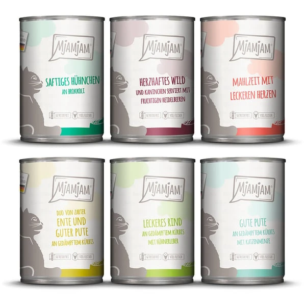 MjAMjAM – gute Pute an gedämpftem Kürbis mit Katzenminze 400g: Rohprotein 10,5%, Fettgehalt 6,5%, Rohasche 2,3%, Rohfaser 0,4%, Feuchtigkeit 78%, Calcium 0,3%, Phosphor 0,25%, Kalium 0,15%, Natrium 0,12%.