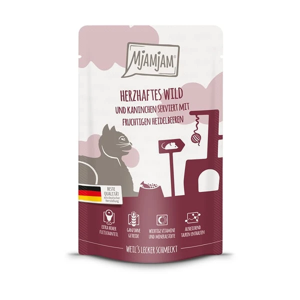 Wildfleisch (34,5%), Kaninchenfleisch, -herz, -leber, -lunge, -niere (34,5%), Fleischbrühe (27%), Heidelbeeren (3%), Mineralstoffe (0,5%), Eierschalen (0,5%)