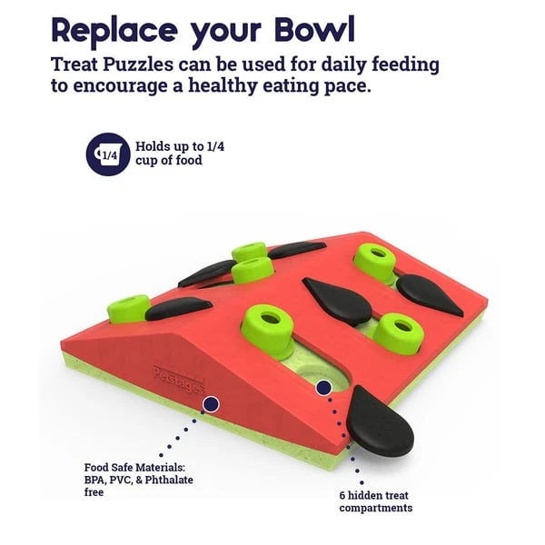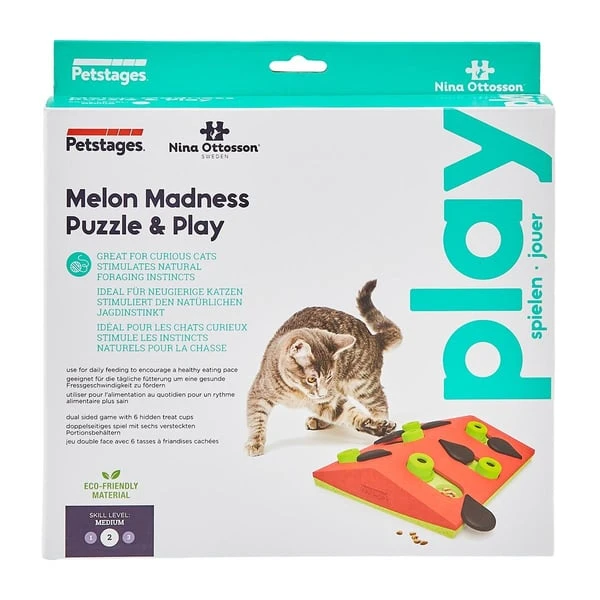 Deine schlauen Katzen werden die Herausforderung lieben, die ihnen Melon Madness Puzzle & Play von Nina Ottosson bietet. Sie können nach den Steckteilen schlagen und die Kerne drehen, um die 6 verborgenen Leckerlifächer aufzudecken. Passe den Schwierigkeitsgrad des Spiels an, damit es für Anfänger einfacher ist, während die ganz schlauen Katzen vor eine richtige Herausforderung gestellt werden können. Bei jedem Spielzeug ist ein englischsprachiges Infoblatt mit Tipps und Tricks enthalten, das dir verrät, wie du das Beste aus dem Spiel herausholen kannst. Ersetze den Standardnapf und füttere deine Katze mithilfe des Spielzeugs, damit sie ihre natürlichen Instinkte zur Jagd und Futtersuche ausleben kann. Das Spielzeug bietet ein Fassungsvermögen für bis zu ca. 60 g.