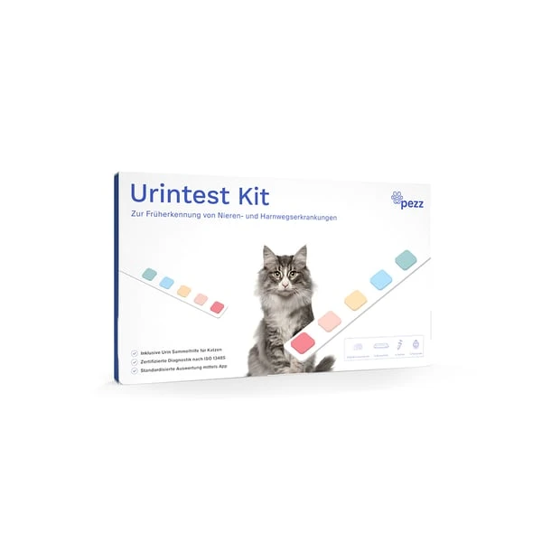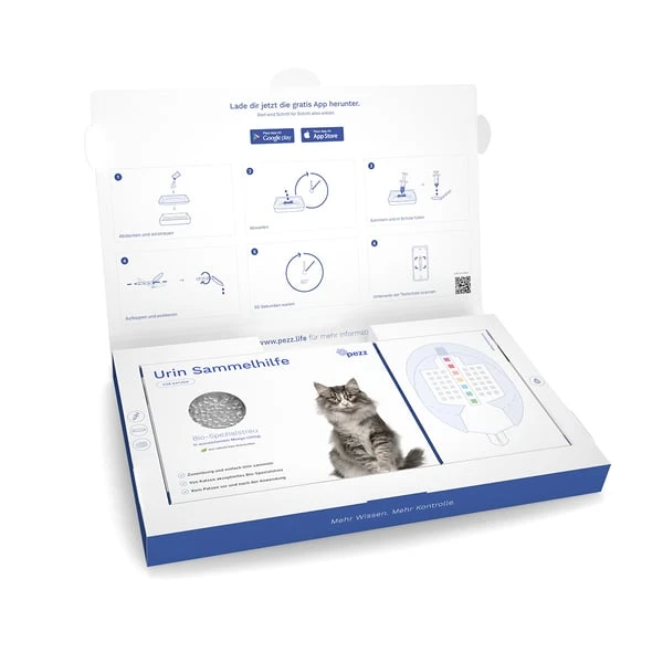 Teste mit dem All-in-One Urintest Kit zuhause, stressfrei und ohne lange Wartezeiten. Erkenne mit regelmäßigen Tests viele der häufigsten Katzenkrankheiten frühzeitig. Erhalte dein Ergebnis einfach erklärt und von unserem Fachpersonal geprüft innerhalb weniger Minuten in der kostenlosen Pezz-App.
