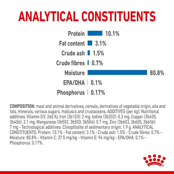 Protein: 10,1 % – Fettgehalt: 3,1 % – Rohasche: 1,5 % – Rohfaser: 0,7 % – Feuchtigkeit: 80,8 % – Vitamin C: 37,5 mg/kg – Vitamin E: 94 mg/kg – EPA/DHA: 0,1 % – Phosphor: 0,17 %