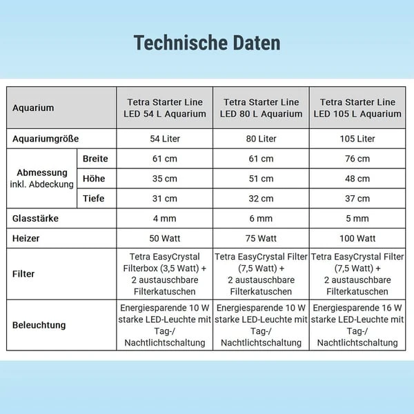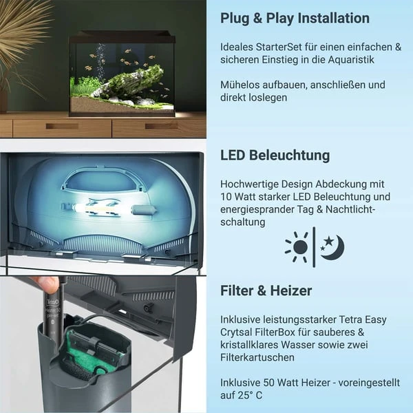 Die Tetra Starter Line Aquarien sind ideal für alle Aquaristik-Einsteiger geeignet. Die Aquarien sind nicht nur in vier verschiedenen Größen erhältlich (30, 54, 80 und 105 Liter), sondern auch mit hilfreichen Funktionen und wesentlichem technischen Zubehör ausgestattet. So ist das kleinere Modell besonders gut für Krustentiere und Pflanzen geeignet. Guppys, Platys und Co. halten Sie dagegen ideal im Aquarium der mittleren Größe. Die besonders stabilen Aquarienbecken sind mit vier Millimeter starken Scheiben aus einem speziellen Float-Glas ausgestattet und sorgen somit aus jedem Blickwinkel für eine unverzerrte Sicht auf Ihre Aquarienbewohner. Auch die Aquarienabdeckung ist besonders robust, damit zum Beispiel kletterfreudige Krebstiere nicht entwischen können. Eine praktische Futterklappe im Deckel sorgt dafür, dass du deine Fische ganz einfach füttern kannst, ohne die Abdeckung abnehmen zu müssen. Die in der Abdeckung integrierte zehn Watt starke LED-Leuchte mit Tag-/ Nachtlichtschaltung lässt dein Aquarium in einem hellen und natürlichen Licht erstrahlen und ist dabei besonders energiesparend und langlebig. Zusätzlich sorgt der im Set enthaltene Tetra EasyCrystal Filter für sauberes und kristallklares Wasser, da er Algen und Verunreinigungen zuverlässig beseitigt. Und das funktioniert so: Bei der biologischen Filterung sorgen Bio-Filterbälle und ein Filterschwamm für die Ansiedlung nützlicher Bakterien. Bei der mechanischen Filterung dagegen entfernt ein Filter-Vlies kleinste Schwebeteilchen aus dem Wasser. Und das Beste: Durch austauschbare Filterkartuschen bleibt dir eine aufwendige Reinigung des Filtergehäuses erspart. Die Kartuschen sind kinderleicht und ohne nasse Hände einsetzbar. Für eine optimale Wasserqualität solltest du die Kartuschen alle vier Wochen auswechseln. Eine Ersatz-Filterkartusche ist im Set enthalten. Die Komplettsets des 54, 80 und 105 Liter Aquariums enthalten zudem einen zuverlässigen Heizer, der die Wassertemperatur konstant bei 25°C hält. Detaillierte Angaben zum Fischbesatz ist der Verpackung des jeweiligen Aquariums zu entnehmen. Die einfache Installation und das umfassende technische Zubehör machen das Tetra Starter Line Aquarium zum idealen Aquarium für jeden Aquaristik-Einsteiger.