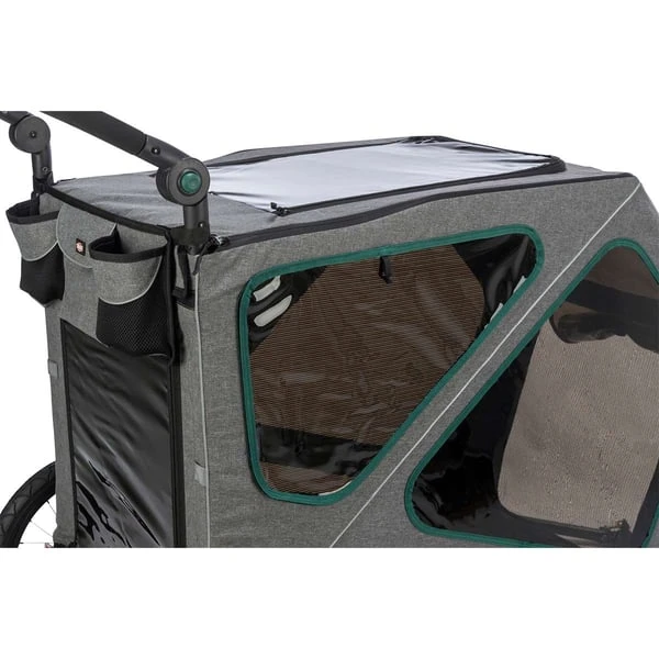 Der Trixie Fahrrad-Anhänger ist ein sicherer und bequemer Weg, deinen Vierbeiner mit auf Radtouren zu nehmen. Der Anhänger ist aus robustem Metall gefertigt und hat eine grau-grüne Farbkombination. Dein Liebling kann es sich auf der großen Liegefläche gemütlich machen und die Fahrt genießen. Das praktische Regenverdeck schützt dabei vor unerwarteten Wetterumschwüngen.