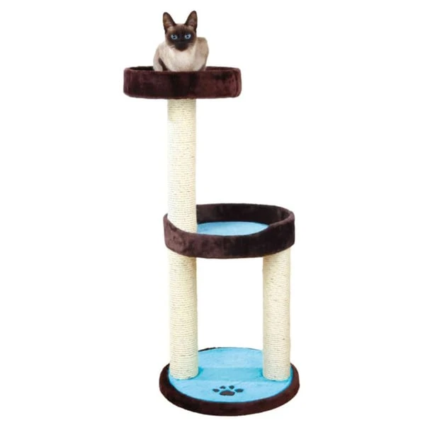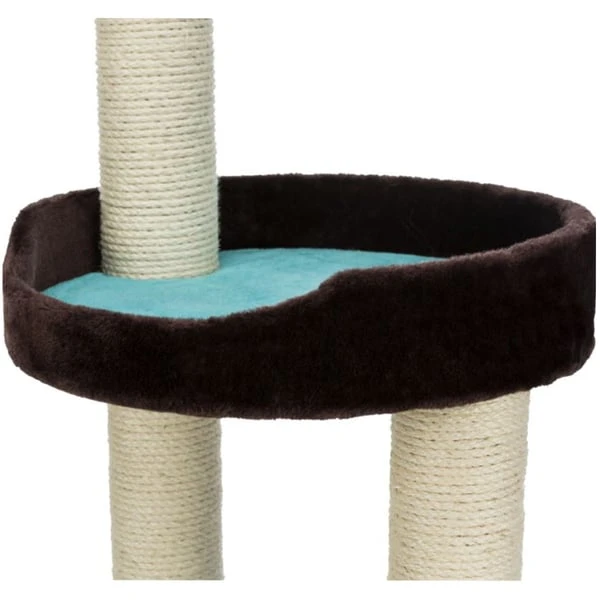 Der Trixie Kratzbaum Lugo ist durch seine moderne Farbgebung in braunen und türkisen Elementen sofort ein Blickfang.